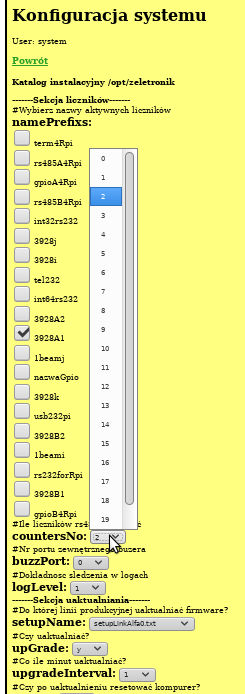 Dla każdego licznika z rozwijanych list wybieramy nazwę portu i adres licznika.